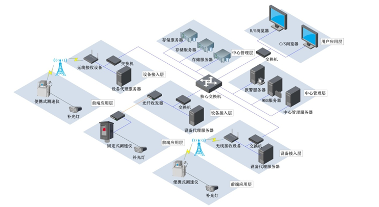 雷達(dá)測(cè)速抓拍系統(tǒng)主要由圖像采集子單元、網(wǎng)絡(luò)傳輸子單元和中心管理子單元三部分。前端圖像采集子單元主要由測(cè)速抓拍儀、補(bǔ)光設(shè)備和輔助支撐設(shè)備組成,測(cè)速抓拍儀分固定式和便攜式兩種安裝方式;網(wǎng)絡(luò)傳輸子單元主要由交換機(jī)、光纖收發(fā)器或者無(wú)線(xiàn)路由器組成,完成數(shù)據(jù)的有線(xiàn)或無(wú)線(xiàn)傳輸;中心管理子單元主要由中心管理軟件和硬件設(shè)備組成,完成數(shù)據(jù)的后期挖掘和應(yīng)用。