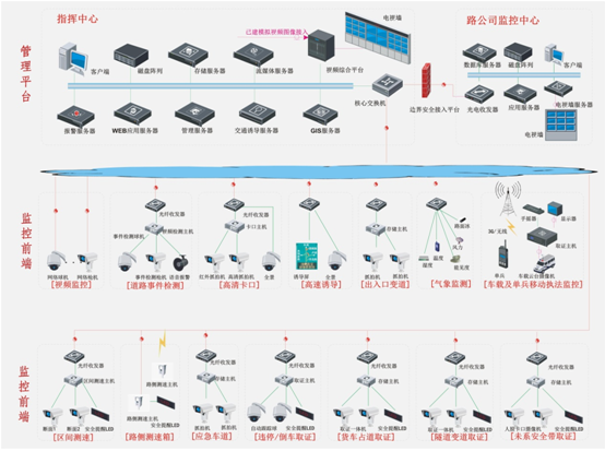 道路智慧監控包括視頻監控、高清卡口、多種違法取證、事件及參數檢測、高速誘導、氣象監測等各種前端采集系統;光網、無線、3G等中間傳輸系統;以及由服務器群組、存儲設備、顯示設備、平臺軟件構成的中心系統。